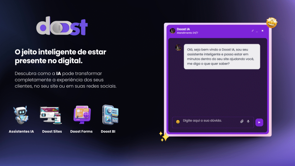 É nesse cenário que nasce o Doost, um ecossistema inteligente que une sites dinâmicos, assistentes virtuais de IA, formulários inteligentes e dashboards de análise em uma única plataforma.